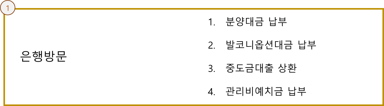 첫 번째, 은행방문은 우리가 청약에 당첨되는 순간 며칠이 안되어서 납부했던 계약금(분양원금의 10%)를 제외하고 분양원금의 10%씩 총 6번을 중도금을 받게됩니다. 물론 형편이 넉넉하신 분들은 중도금을 실행하지 않고 직접 납부 할 수 도 있지만 대부분의 수분양자들은 6번의 분양 대금을 중도금이라는 이름으로 지정 은행에서 받게되는데요. 이때 받았던 중도금은 은행에서 대출 받은 후 시행사에 납부된터라, 이 부분부터 해소를 해야 합니다.