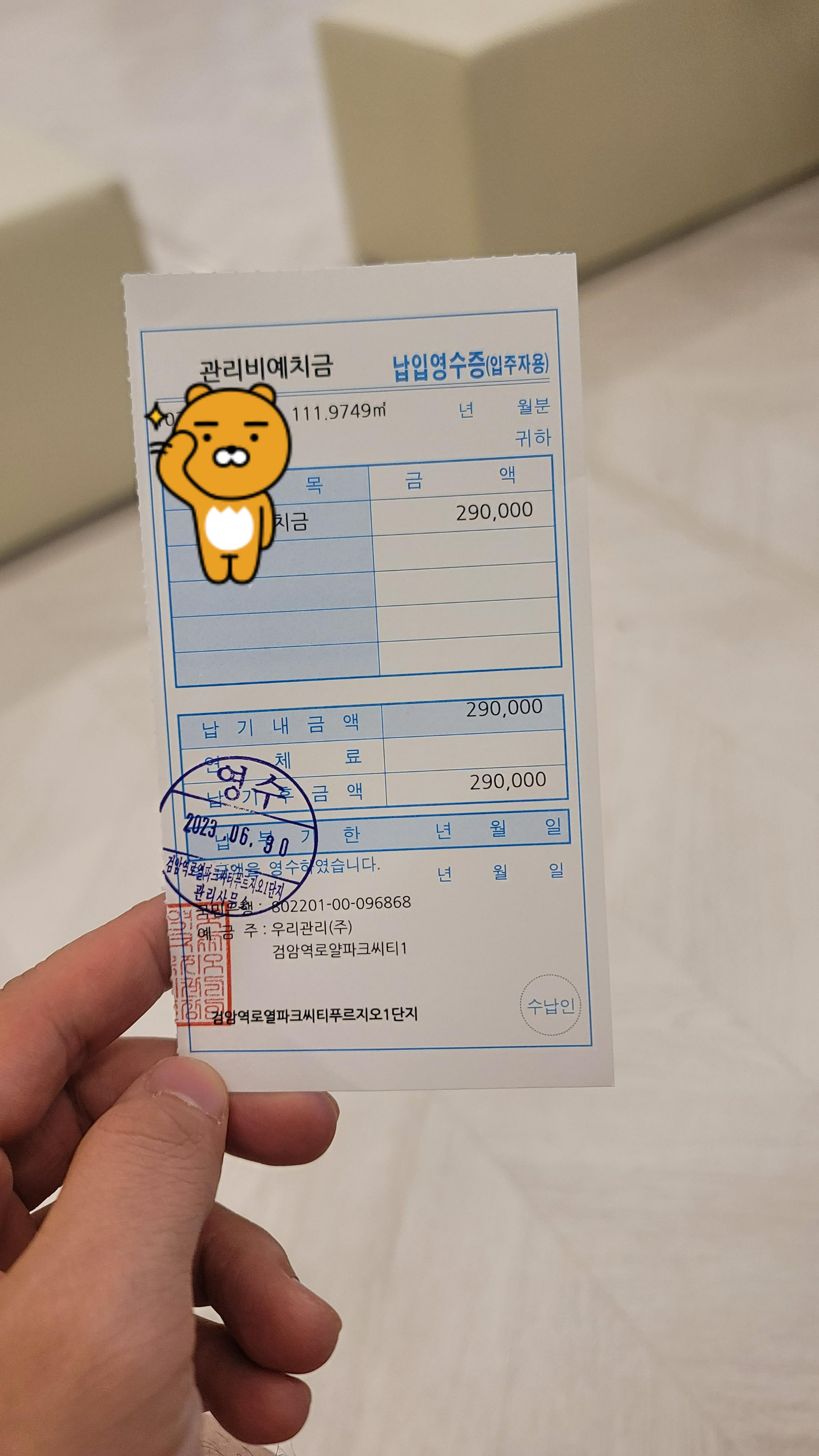 저는 검암역로열파크씨티푸르지오 1단지 84A 타입인데요. 관리비예치금은 총 290,000원 나왔어요. 이렇게 납부하고 영수증을 잘 챙기셔야 합니다. 이때, 관리비예치금을 납부하고 동시에 관리규약 동의서를 작성하면 됩니다. 별다른건 없습니다.(사실 기억 안남.. 모두 같지 않나요? 사이트 가입할때처럼 동의 동의 동의 동의 싸인 ㅋ)