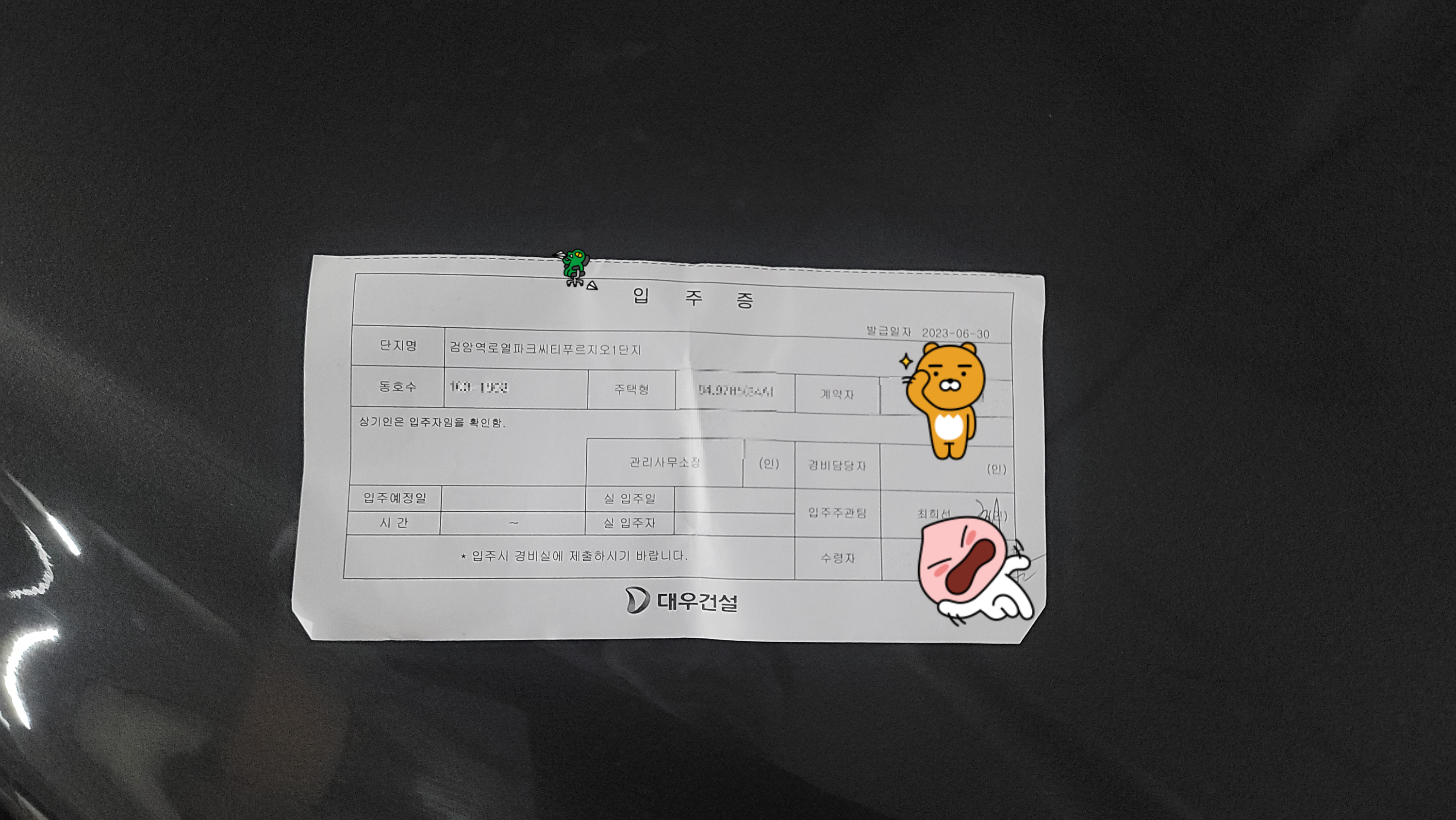 저희는 잔금을 2023.06.30에 치루고 2023.07.07에 이사를 진행했어요. 이사는 순주로웠으며, 위에 말씀드린 것 처럼 이사 업체에 입주증을 건내 줘야 하는데요, 실물로 건내 주던 사진을 찍어 건내 주던 상관은 없습니다. 저는 혹시 모를 분실을 우려해서 사진을 찍어 보내드렸고요. ㅎㅎ