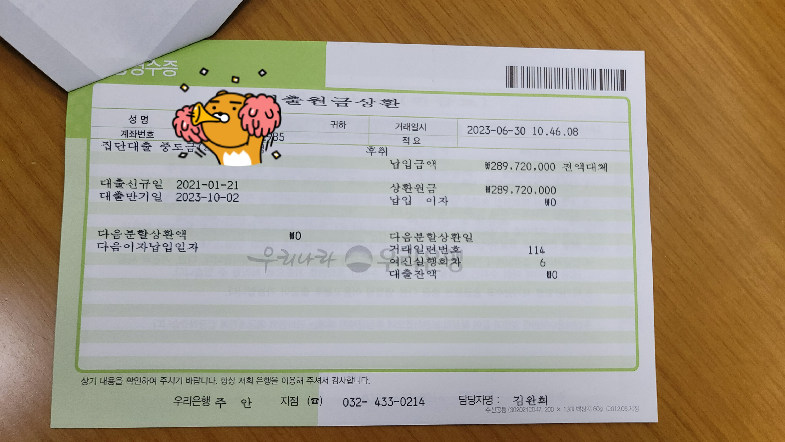 저는 우리은행 주안점에서 중도금 대출을 받았으며, 부산은행이라는.... 인천에 살면서 부산은행이라는 은행이 있었나.. 생각이들 정도로 생소했던 부산은행에서 집단대출을 받았습니다. 보통 중도금 대출을 받은 은행과 집단대출을 받는 은행이 동일하면 별도의 방문없이도 중도금 상환이 가능하다하지만 저는 중도금 대출 은행은 우리은행, 집단 대출 은행은 부산은행으로 서로 상이한 은행인지라 우리은행에 가서 직접 중도금 대출 상환을 했습니다. 금액은 중도금 상환 일 오전에 집단 대출을 실행한 부산은행에서 제 개인 계좌로 중도금 상환에 필요한 금액을 입금시켜주었고, 저는 이 금액으로 중도금 + 중도금 이자를 모두 상환했습니다.