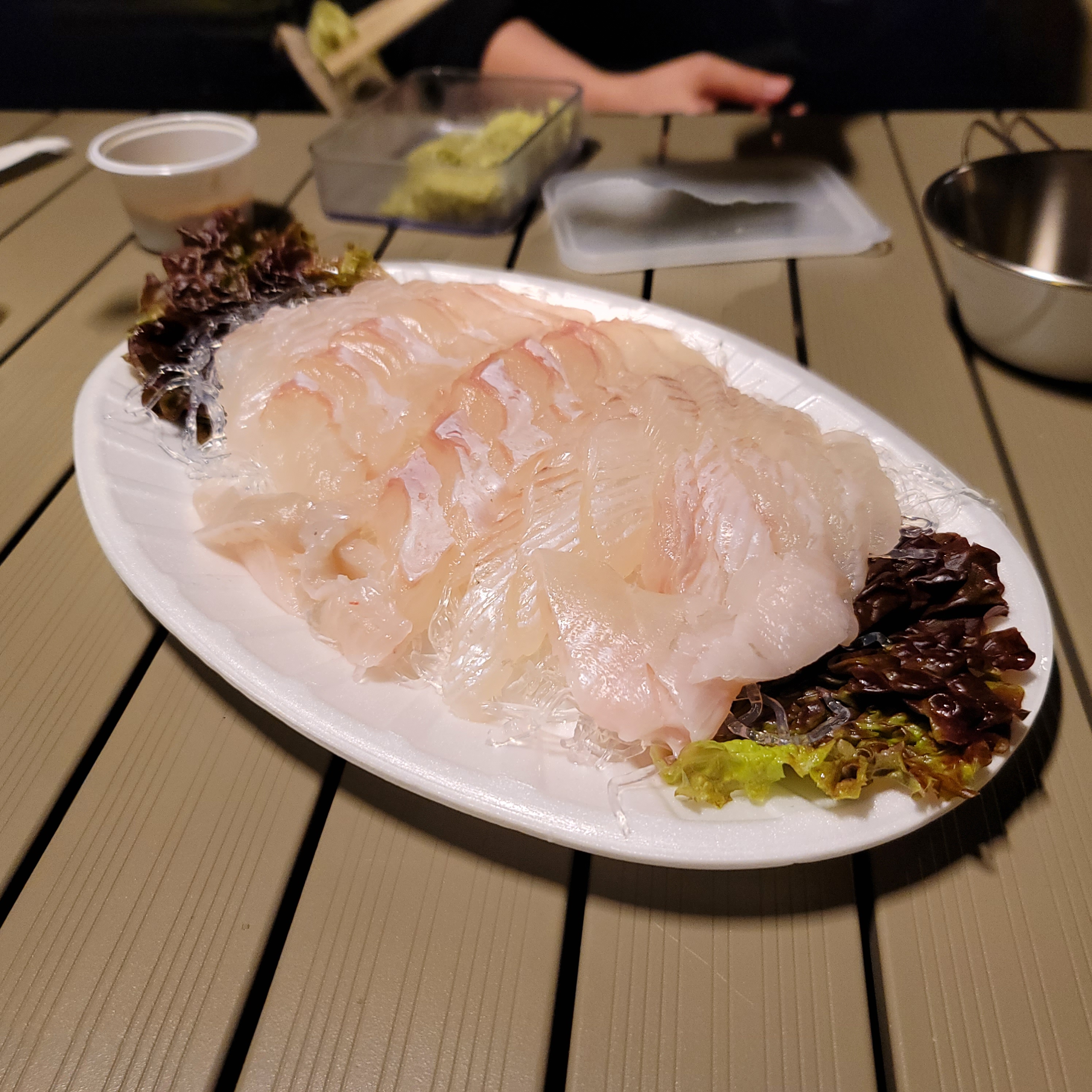 캠핑장 바로 앞에 회집이 있기도 했고, 어렷을때 맛있게 먹던 광어가 생각나서 광어회를 한점 떠 왔어요.