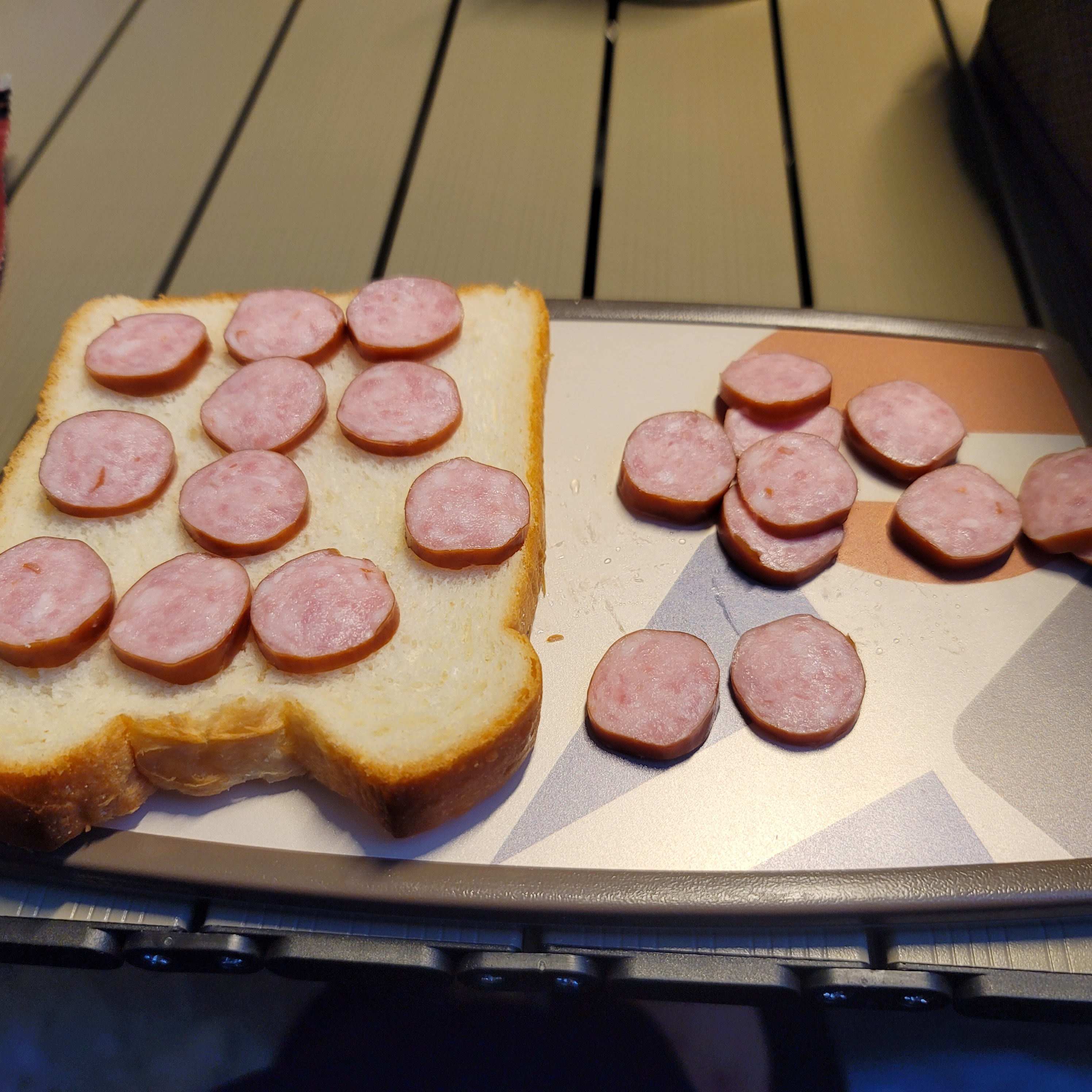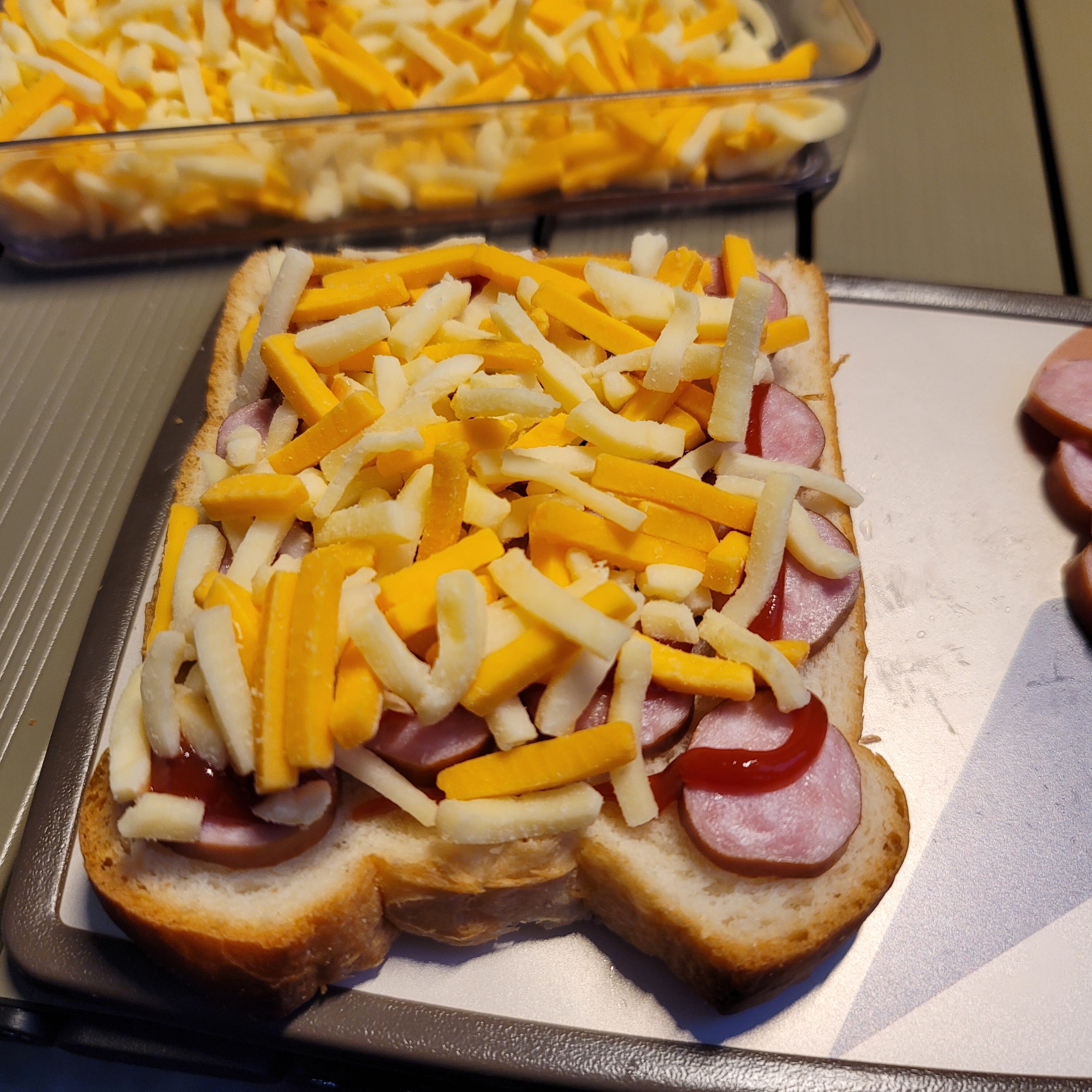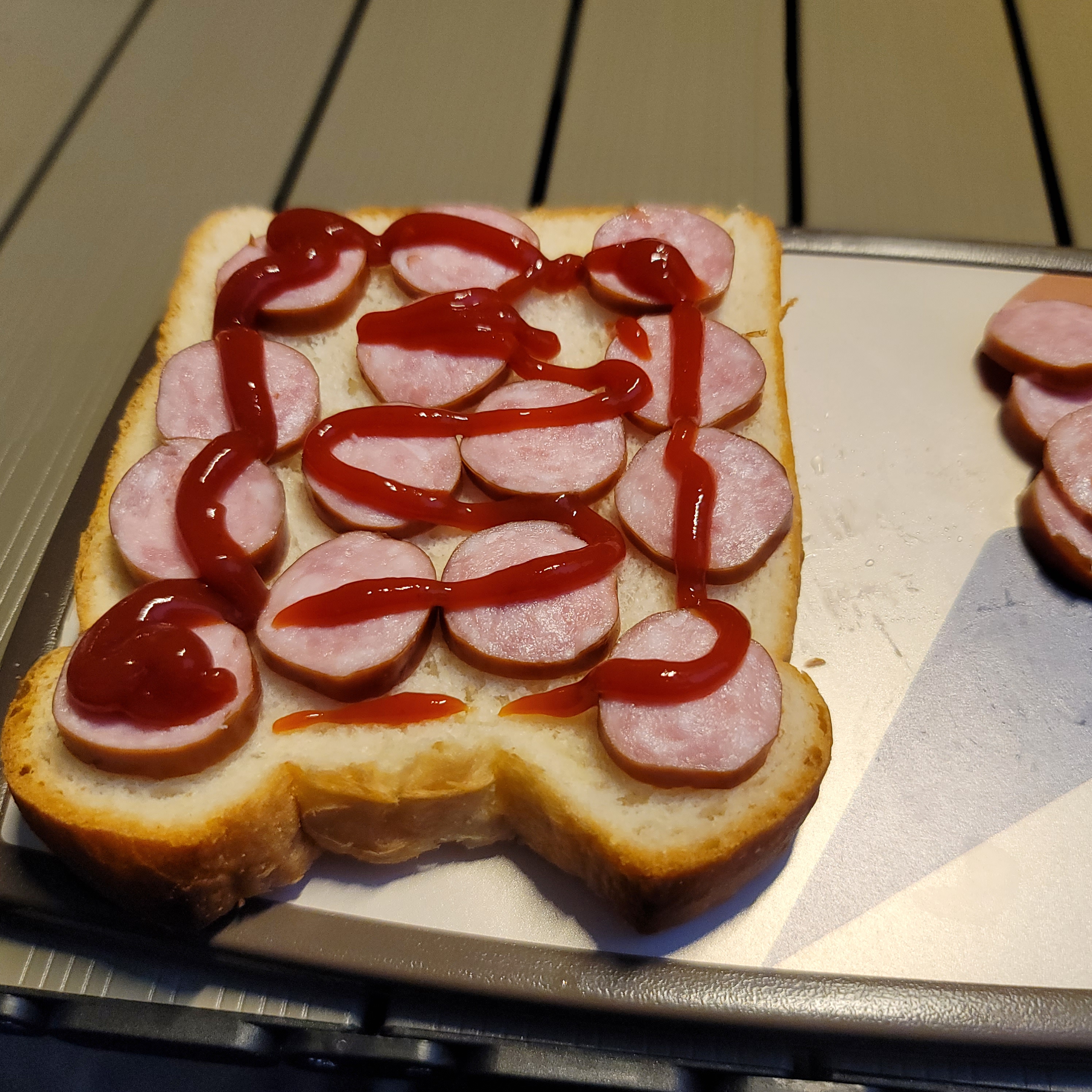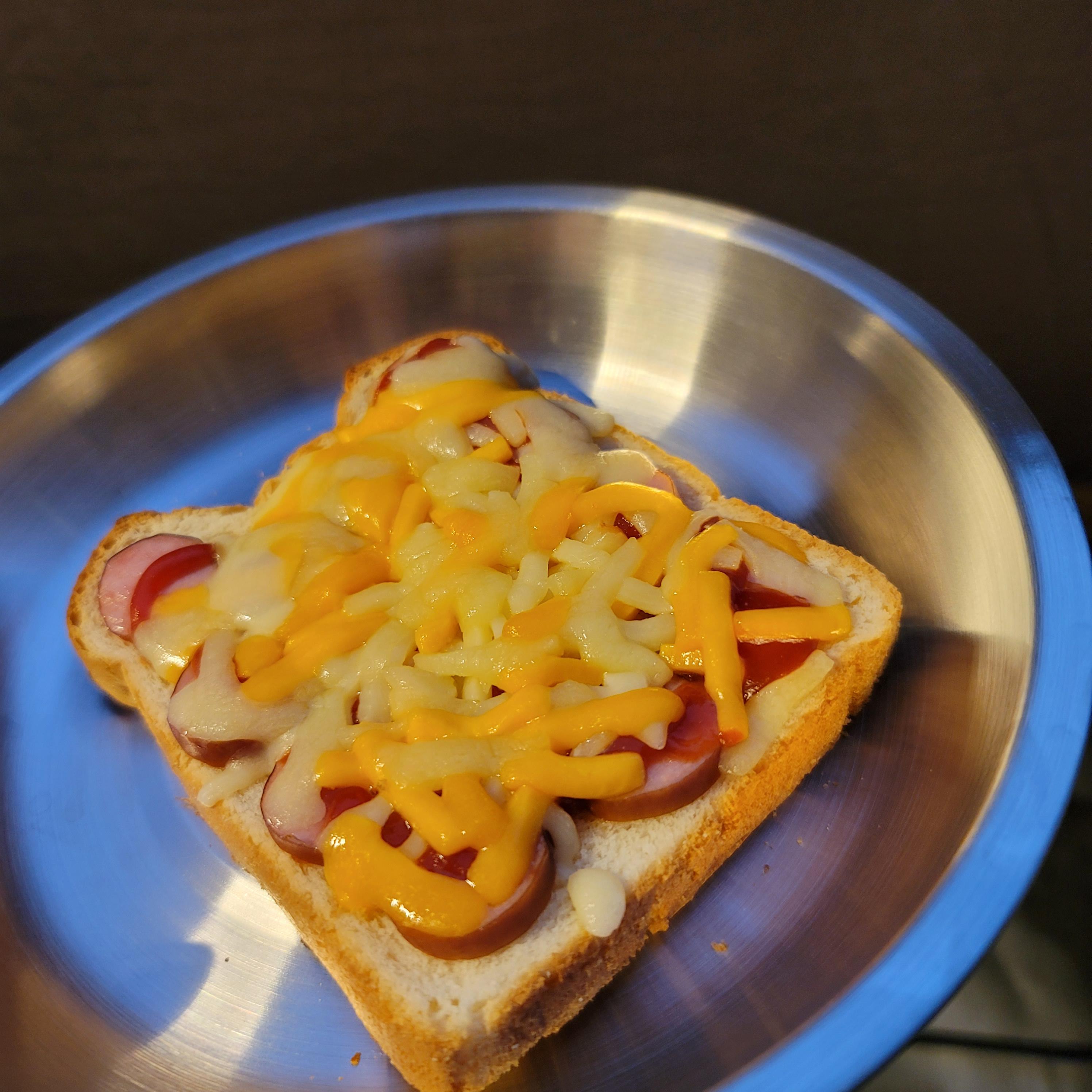 그래서 식빵, 소시지, 케찹 그리고 치즈를 가져와서 나름... 아이 먹여 보려고 피자를 만들어봤는데요.