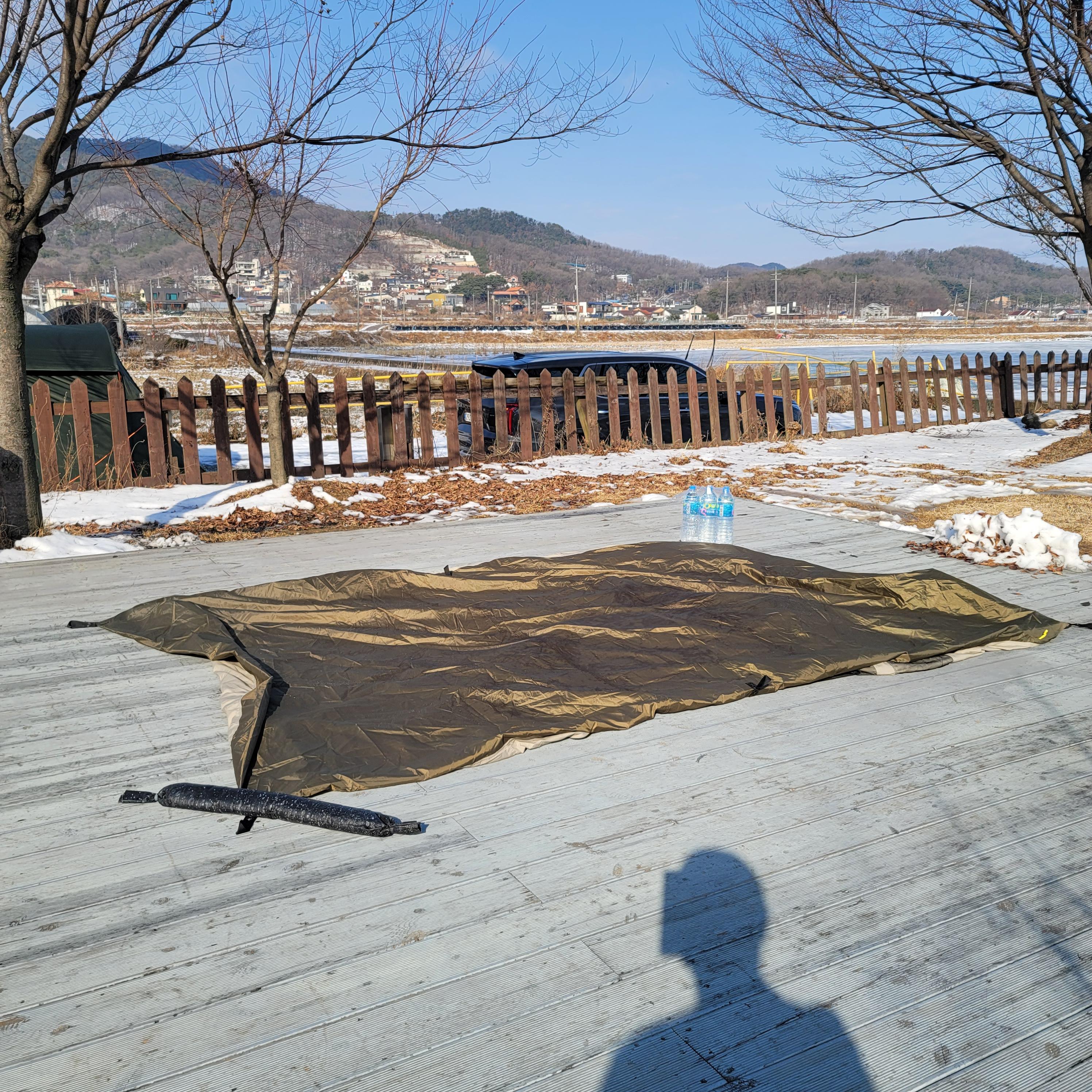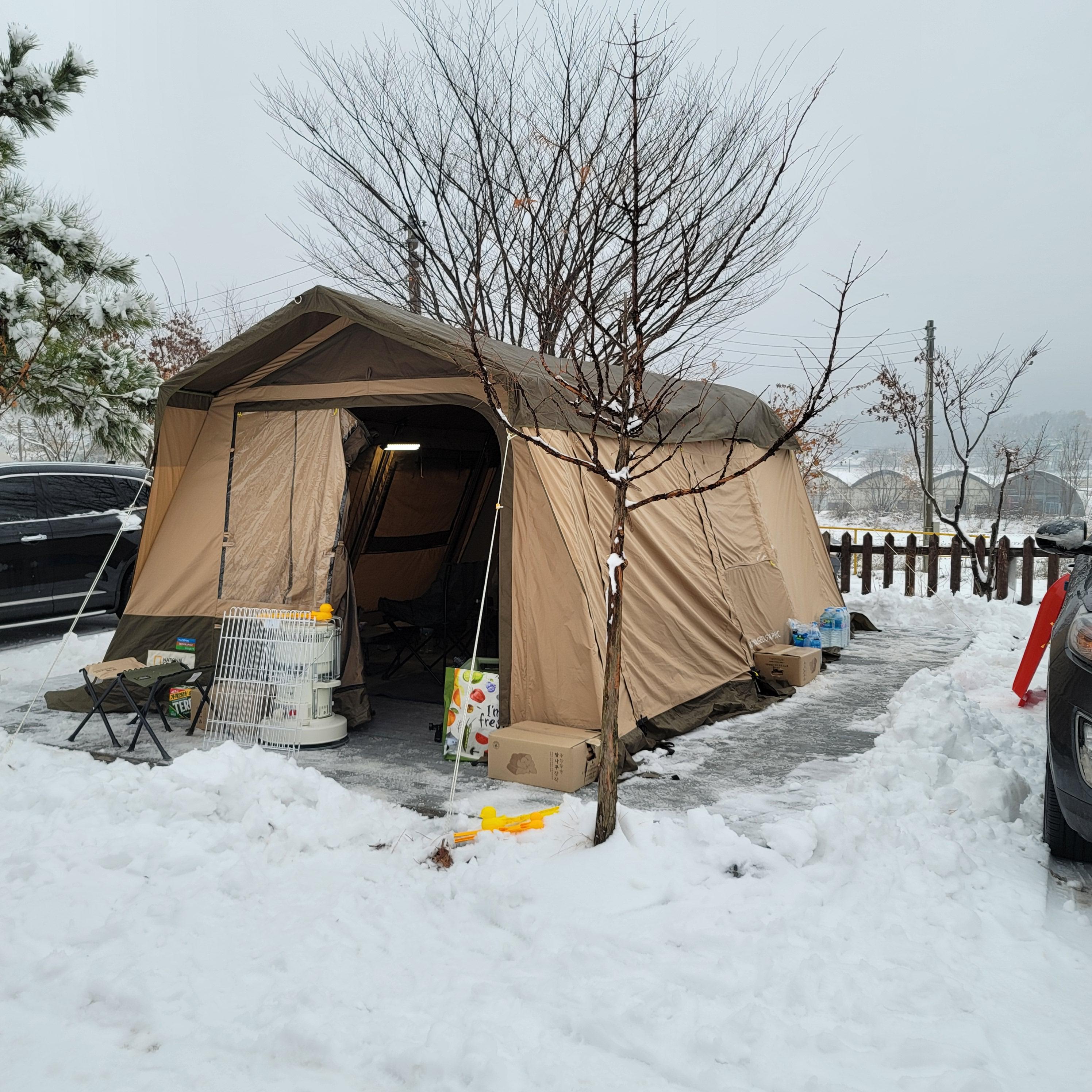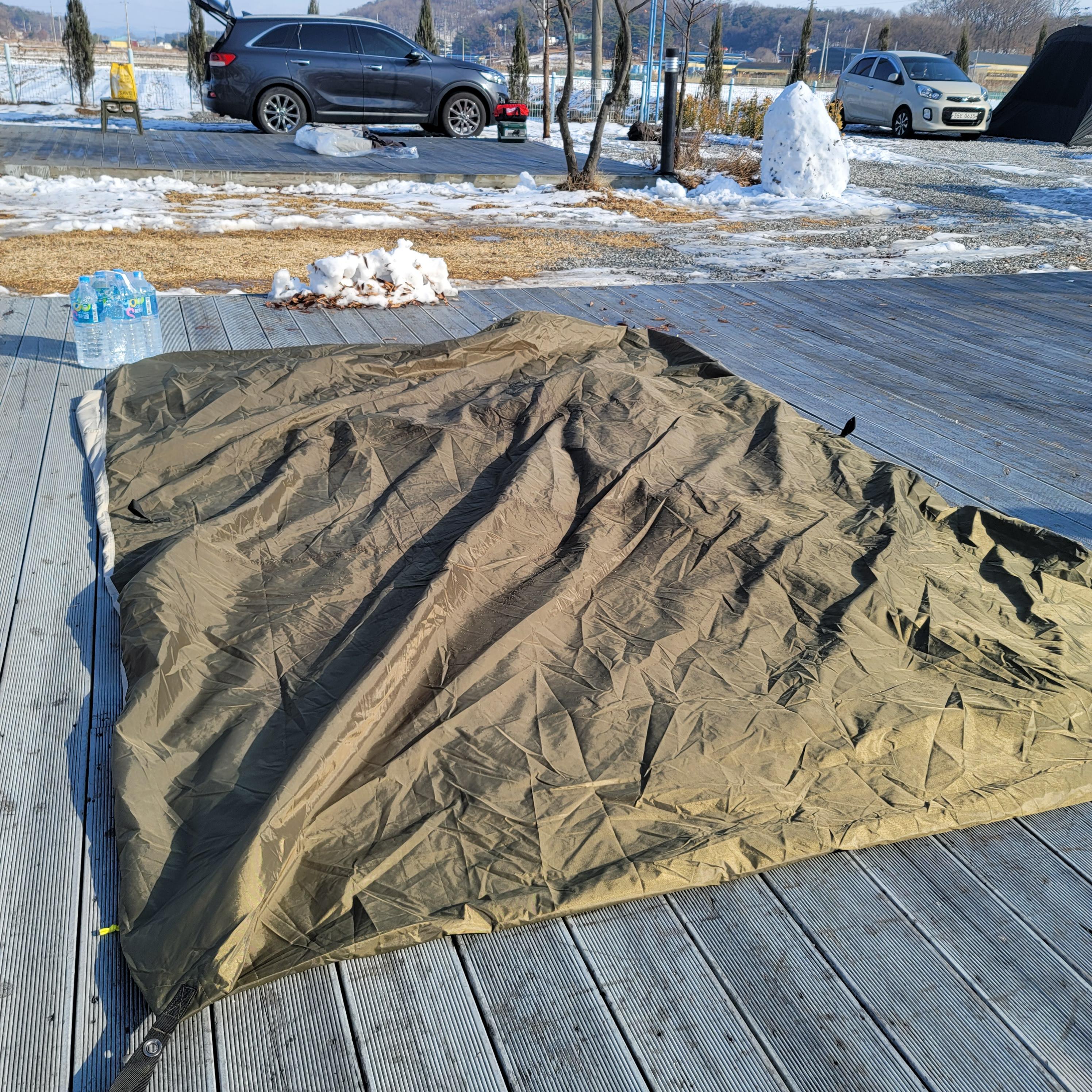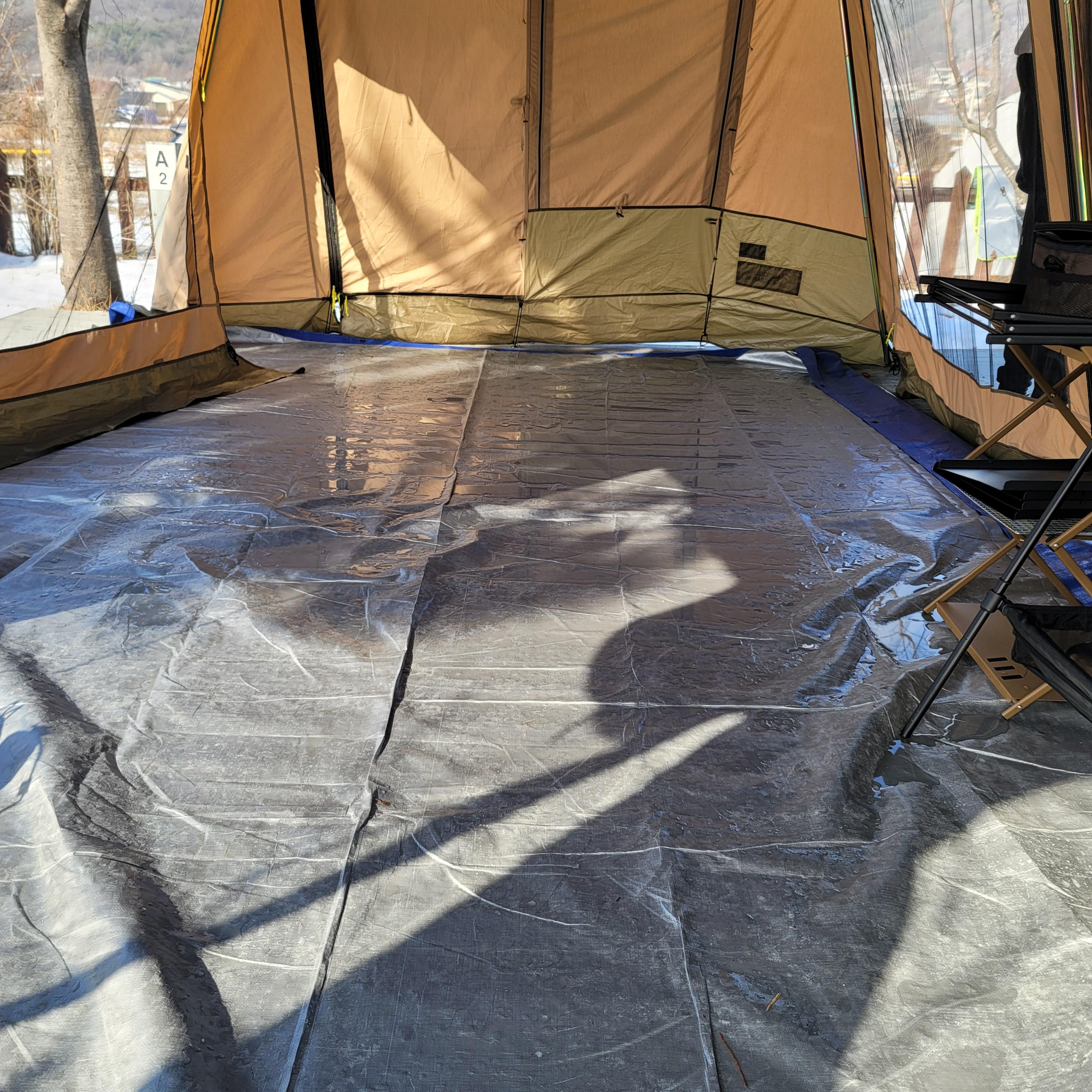 첫날에 펑펑 눈이 왔음에도 불구하고, 바닥 공사를 소홀하게 했더니 새벽 내내 비가 이너텐트 안으로 들어왔어요ㅠ