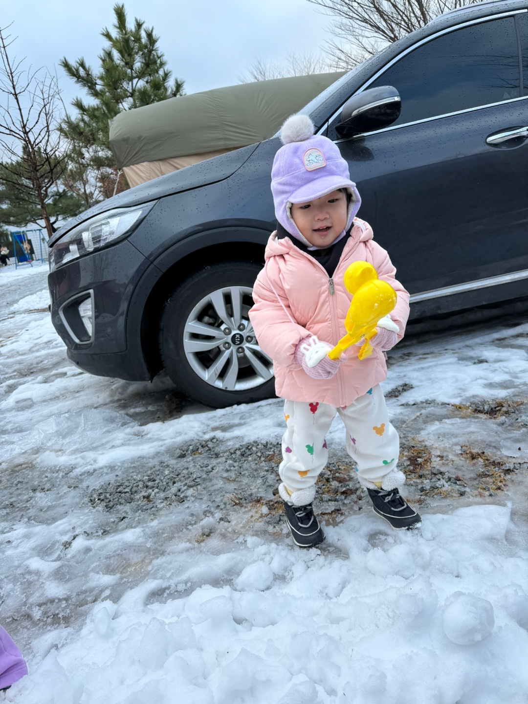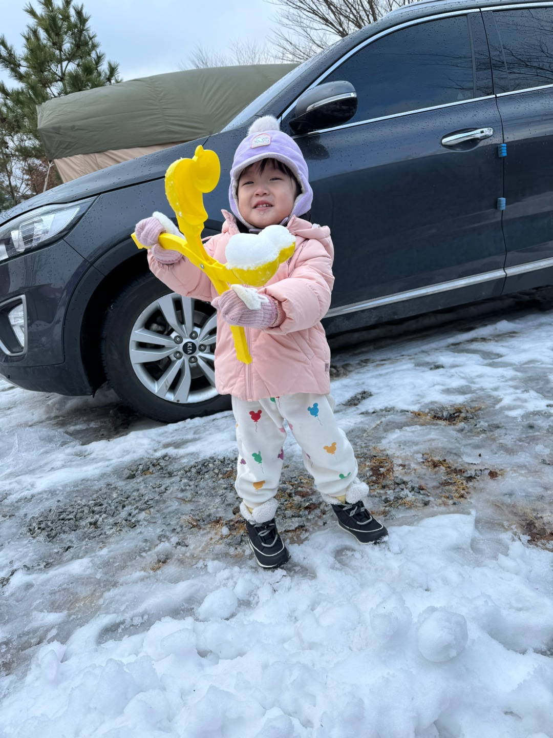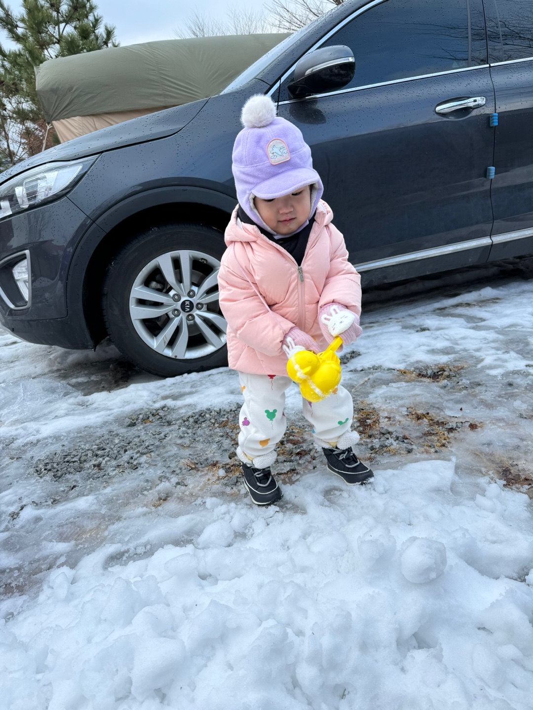 눈으로 오리를 만들고 있네요~ 사랑스러운 아가~