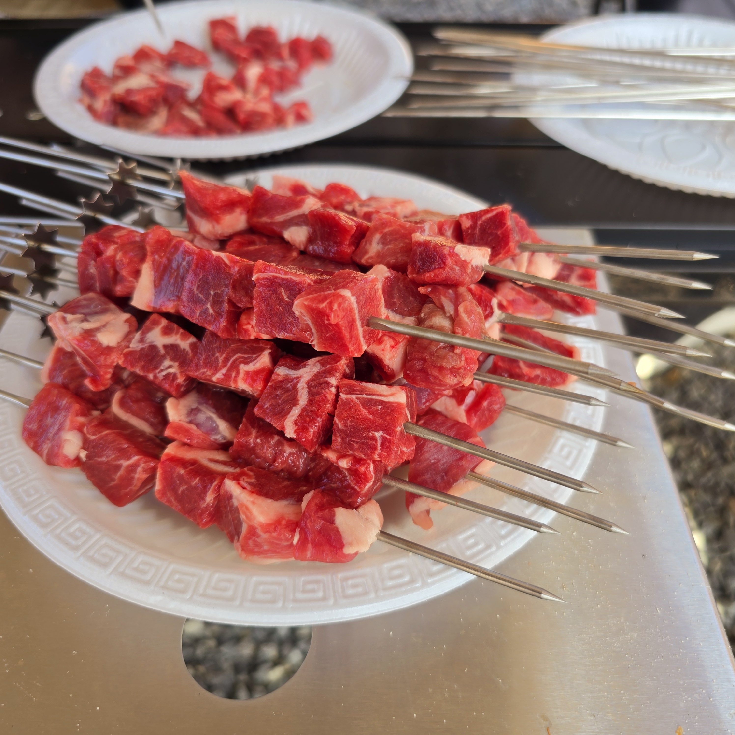 양고기 덩어리를 가져와서, 알맞은 사각 큐브 형태로 손질한 다음 꼬치에 꽂았어요.