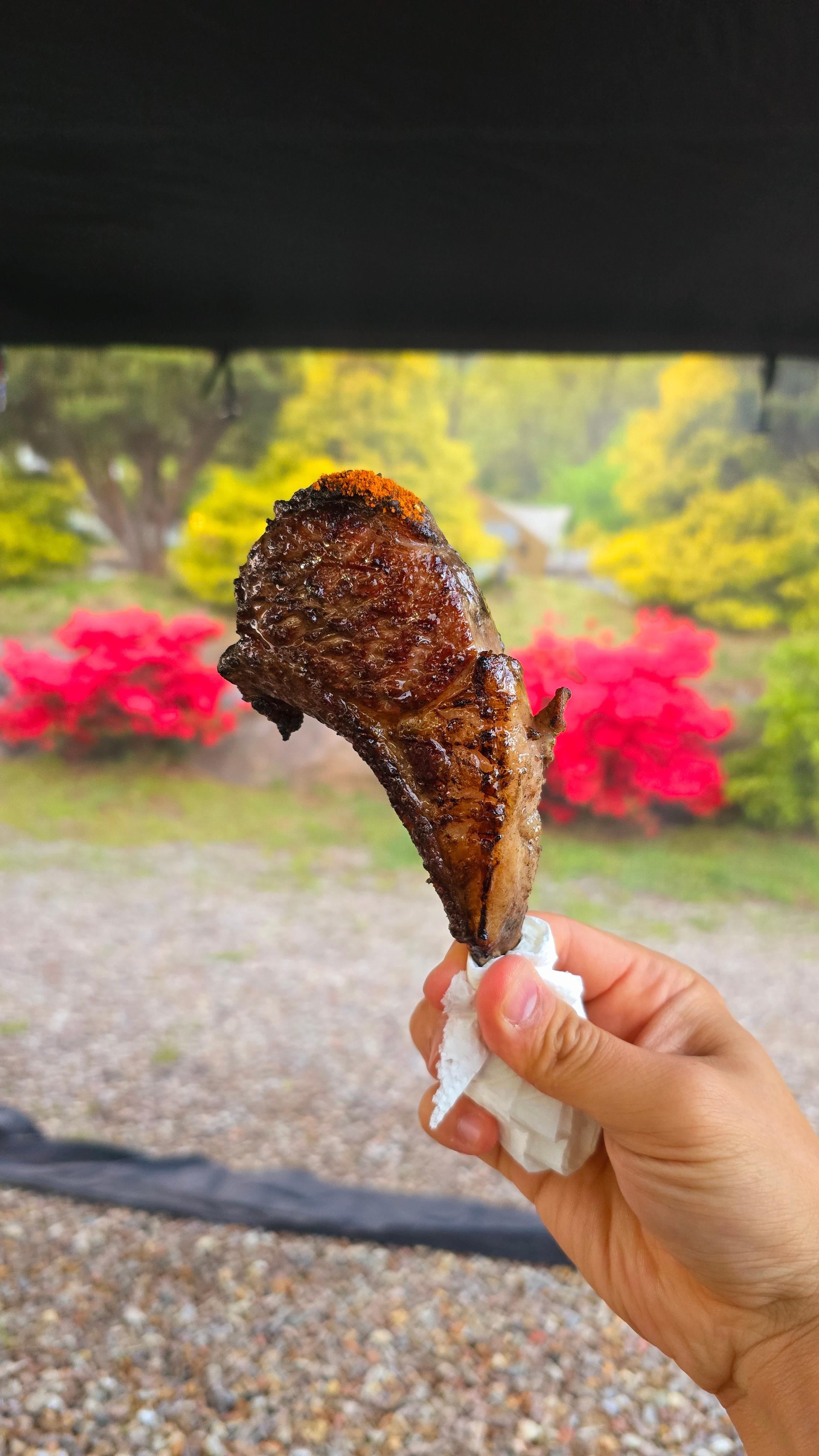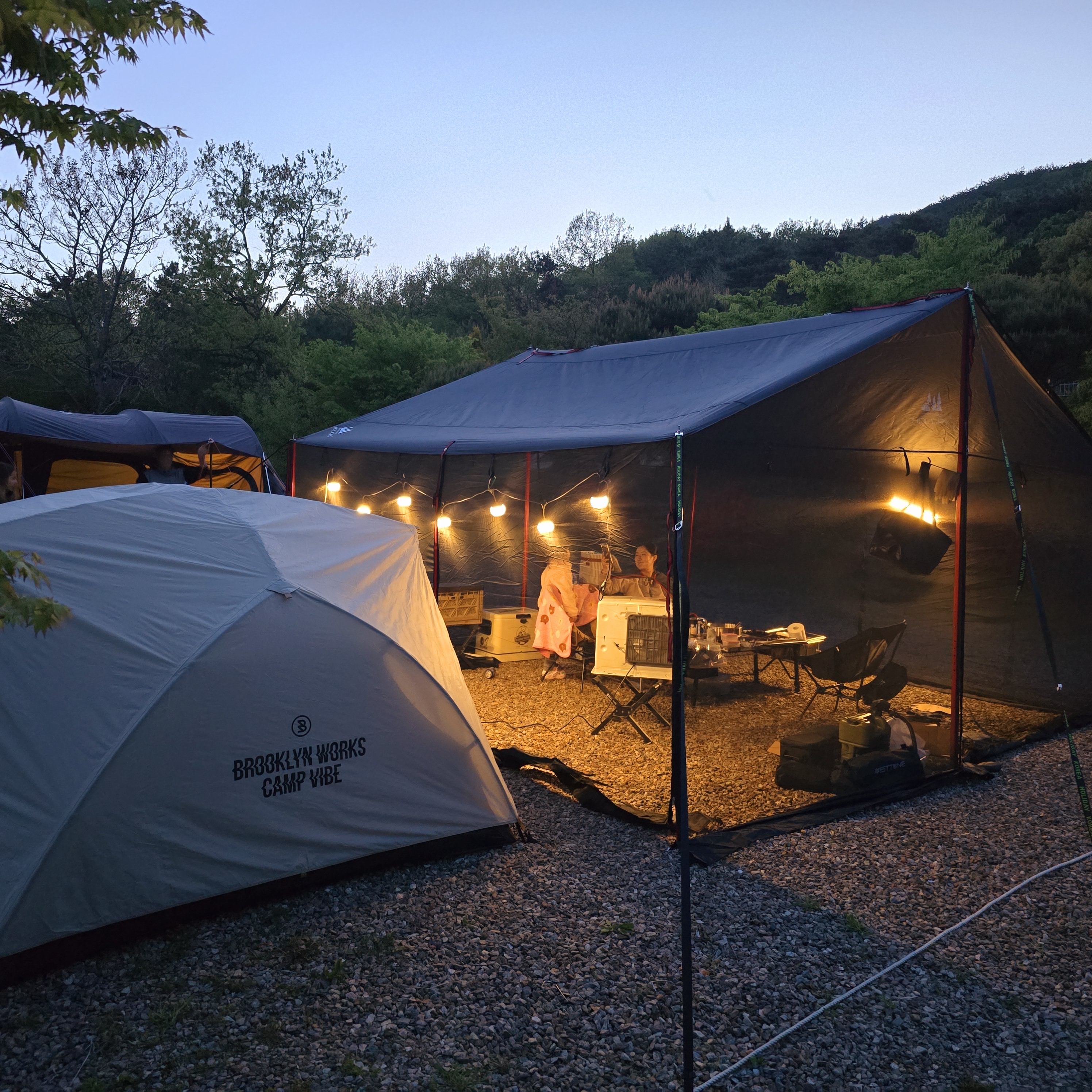 이날은 늦게 도착한 만큼 캠핑장을 여유 있게 둘러보고 텐트와 메시 타프를 피칭했어요. 작은 텐트인 브루클린웍스 로이텐트와 메시스크린 조합은 정말 아름다웠고요, 개인적으로 이번 피칭은 사진으로 남기고 싶을 만큼 마음에 들었답니다. 저녁에는 숯을 피워 양고기를 구워 먹었는데요, 고기의 풍미와 숯불 향이 어우러져 그야말로 최고의 저녁이었어요. 오얏이와 오얏맘 모두 너무 맛있게 먹었고, 기름진 고기에 기분까지 좋아졌어요.