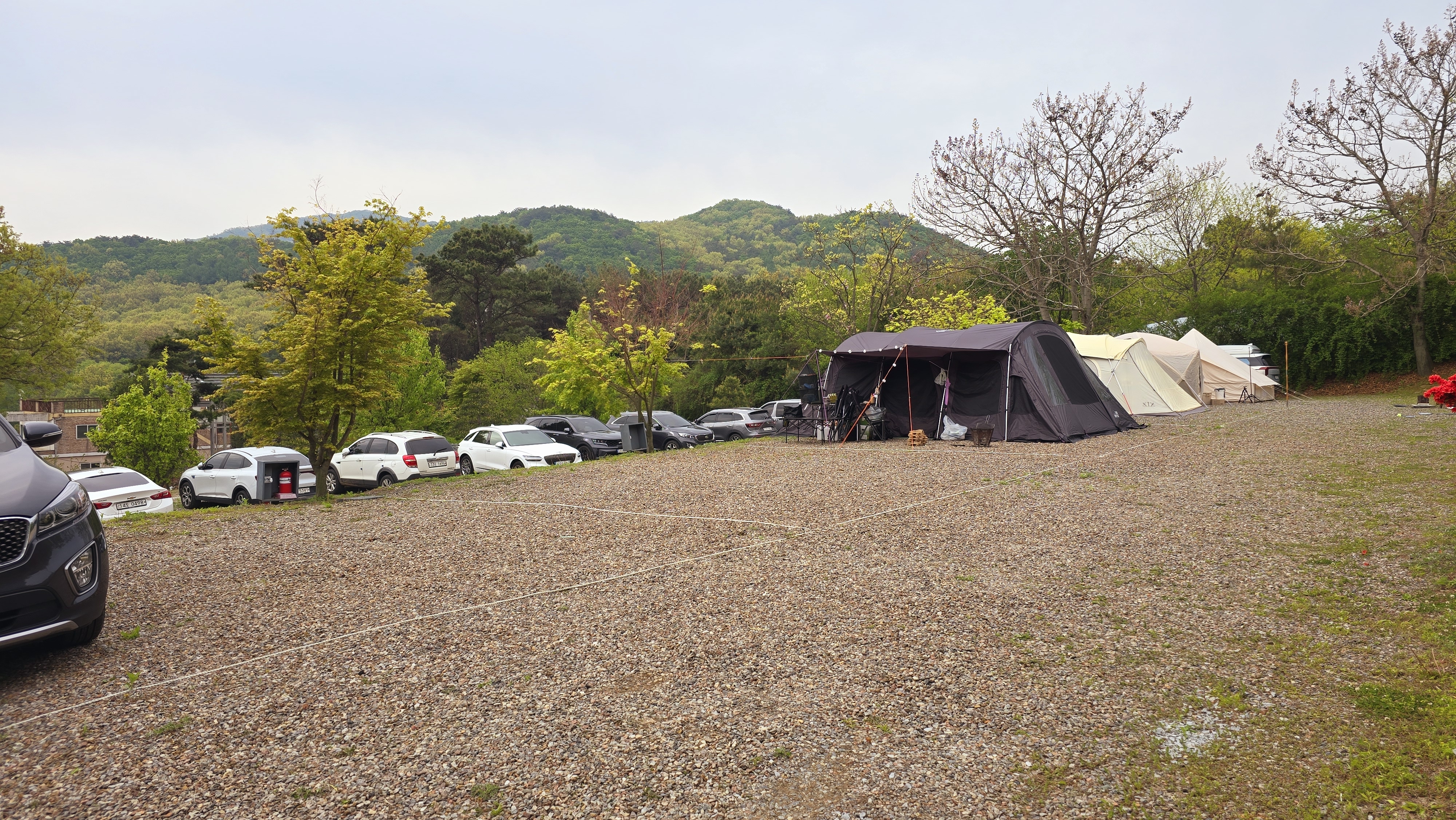 출발 당일 오전에는 비 소식이 있었기 때문에 여유롭게 준비를 마치고, 비가 그친 오후 4시쯤 캠핑장에 도착해 피칭을 시작했어요. 저는 보통 가족과 함께 넉넉한 공간에서 여유롭게 캠핑을 즐기기 때문에 사이트 선택 시 공간을 가장 중요하게 보는데요, 그래서 이번엔 "카라반2번 사이트"를 예약했어요.