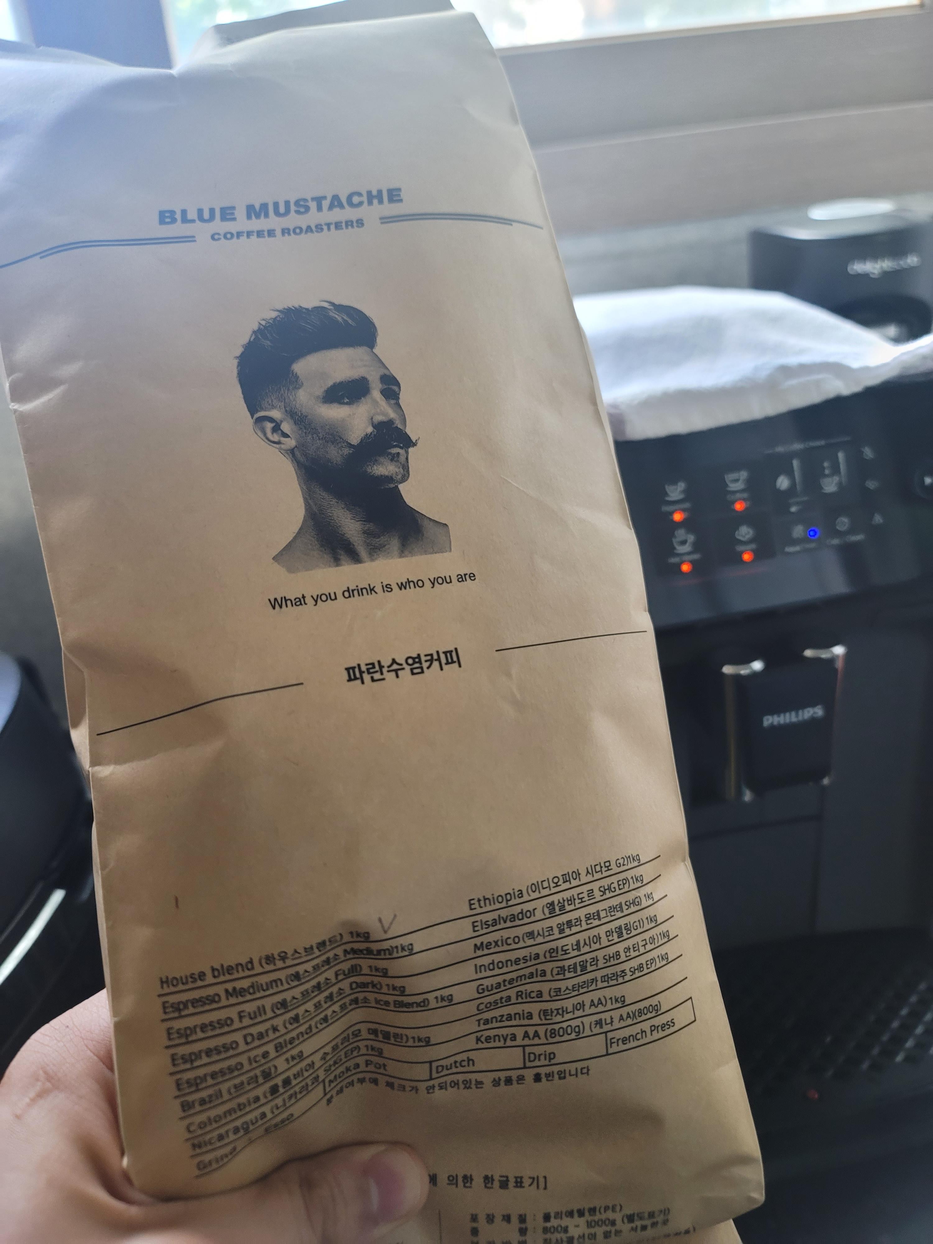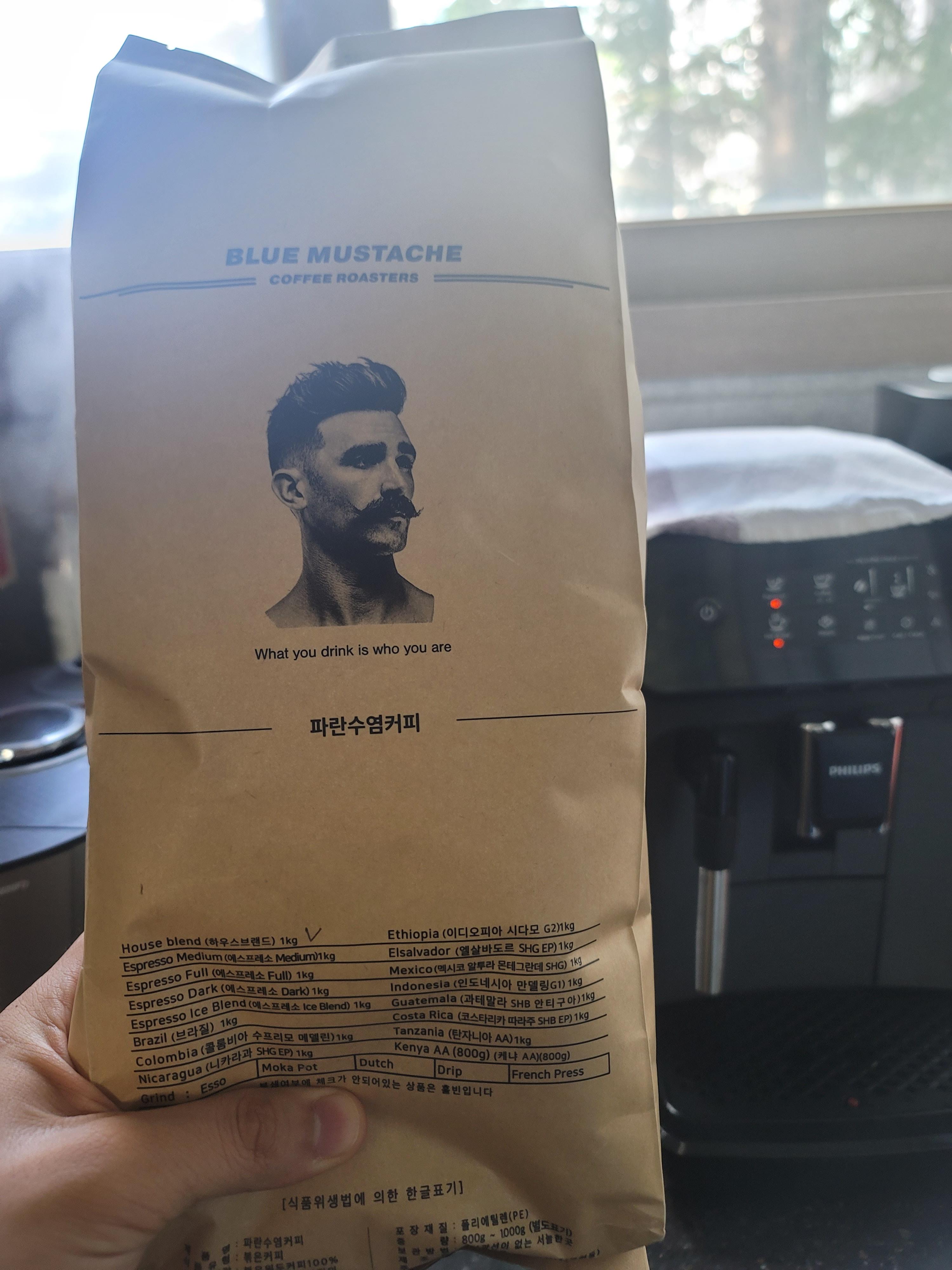 이번에는 blue mustache 라는 로스팅이 되어있는 커피 원두를 사게 되었습니다.