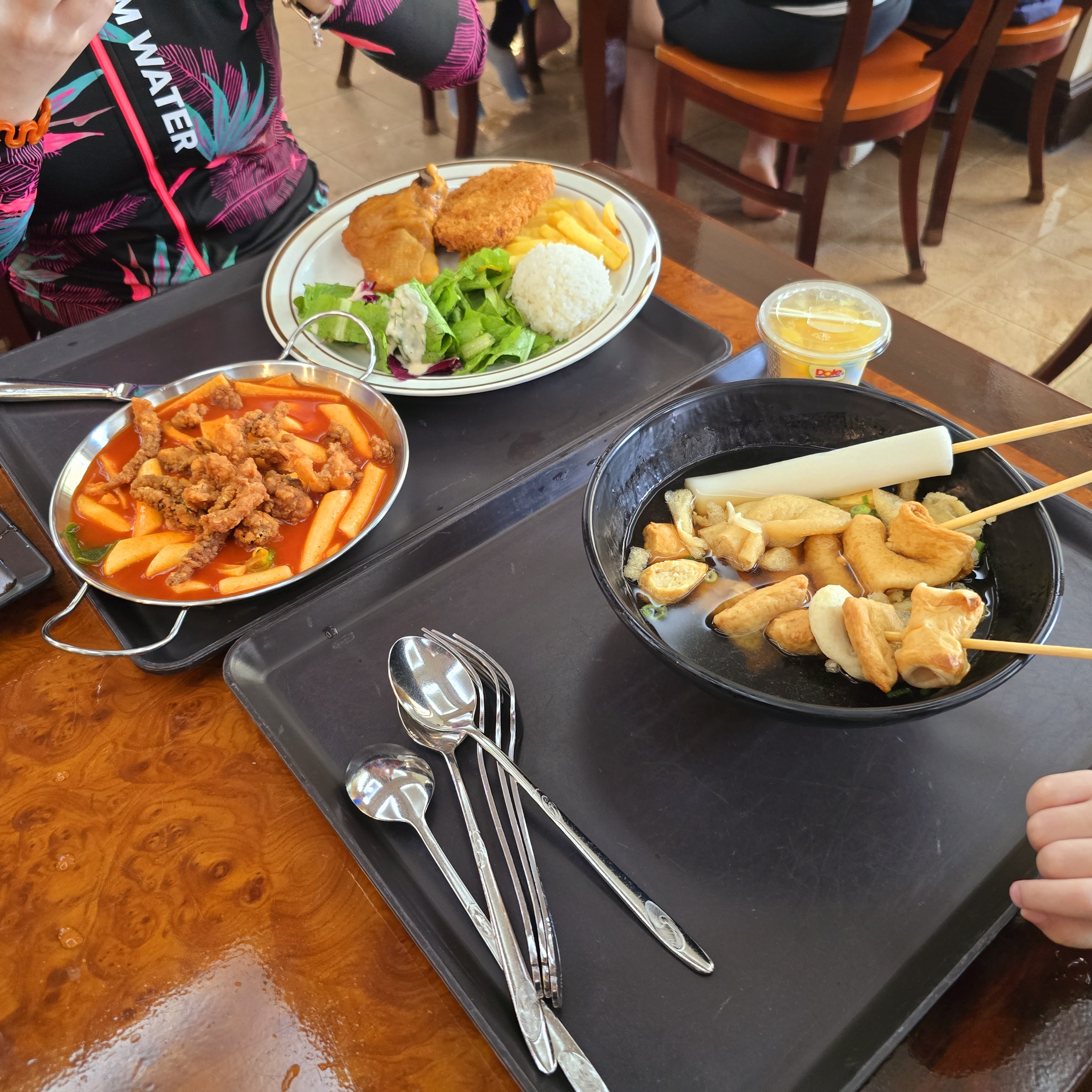 11시쯤 물놀이를 시작해서 한 시간 반 정도 놀고 나니 배가 고프더라고요. 캐리비안베이 안 푸드코트에서 돈가스, 어묵탕, 매콤 떡볶이를 주문해 먹었습니다. 특히 겨울철에는 따뜻한 국물 요리가 더욱 당기는데, 어묵탕이 딱이었어요. 맛있는 음식을 먹으니 다시 힘이 났습니다.